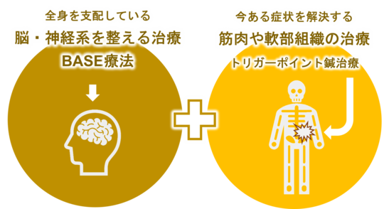 当院では、神経系を整える「BASE療法」と「鍼灸治療」を組み合わせて、全身をコントロールする脳・神経への神経アプローチと筋肉や軟部組織への鍼灸アプローチで症状の改善を目指します。